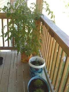Well, lets just say...most of the plants have been outstanding successes! My tomato plant is absolutely HUGE (I am 5'10" and it comes up to just above chest level) and producing lots of tomatos (can't wait until they are ripe!). My lettuce touches the balcony ceiling now. The catnip & mint have grown like weeds. I also added a hen & chick plant and moss to the multitude of plants. The pepper plant almost died, but is making a comeback (although it is currently infested with aphids, stupid little buggers), and may be starting to produce a few peppers (*crosses fingers*).